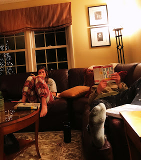 Today would have been a good day to know the weather. I woke up to at least six inches of snow and it's still coming down. It's the kind of snow that you cannot see the road from the yard: a world literally white washed. It's the kind of day that I love with all my heart especially when I don't have to go anywhere. Luckily I can stay home today. Thankfully my brother in law has offered to clear my driveway as Mike is gone. I'm grateful he's such a good guy because when he's done, I'm going to ask him to drive me to Lil's friend's house where she enjoyed some much needed girl time and a sleepover last night, so that I can drive her car home. She has little experience with this kind of driving. Ted is on my shit list for timing his exit to Madison so cleverly.
